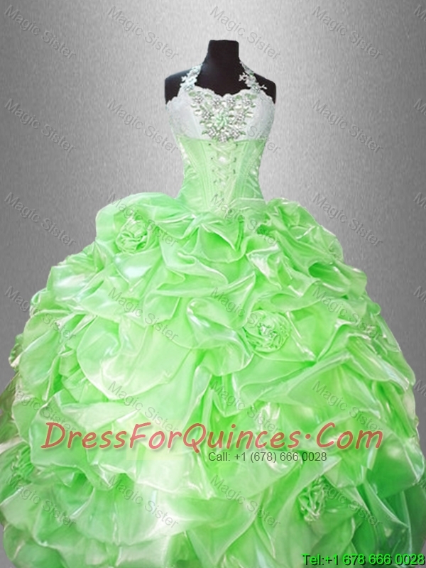Discount Halter Top Pick Ups Quinceanera Gowns in Spring Green