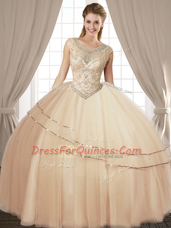 Discount Scoop Beading Ball Gown Prom Dress Champagne Lace Up Sleeveless Floor Length