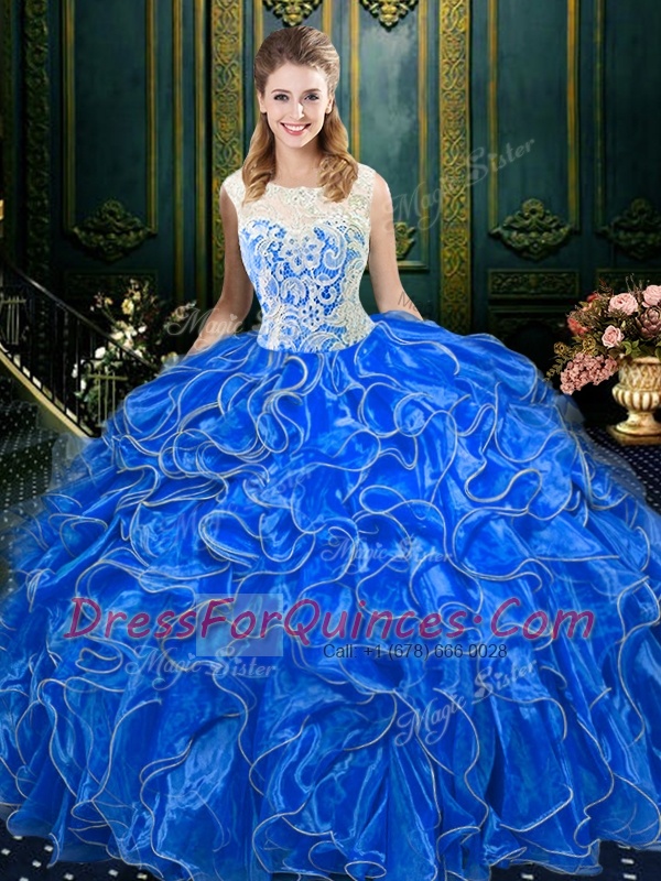 Dramatic Royal Blue Ball Gowns Organza Scoop Sleeveless Lace and Ruffles Floor Length Zipper Quince Ball Gowns
