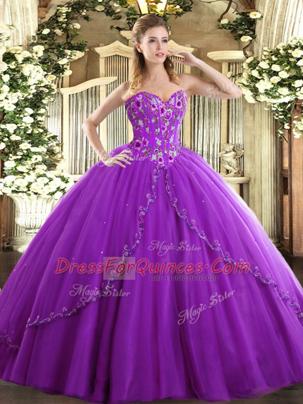 Eggplant Purple Sweetheart Lace Up Appliques and Embroidery Quinceanera Gown Brush Train Sleeveless