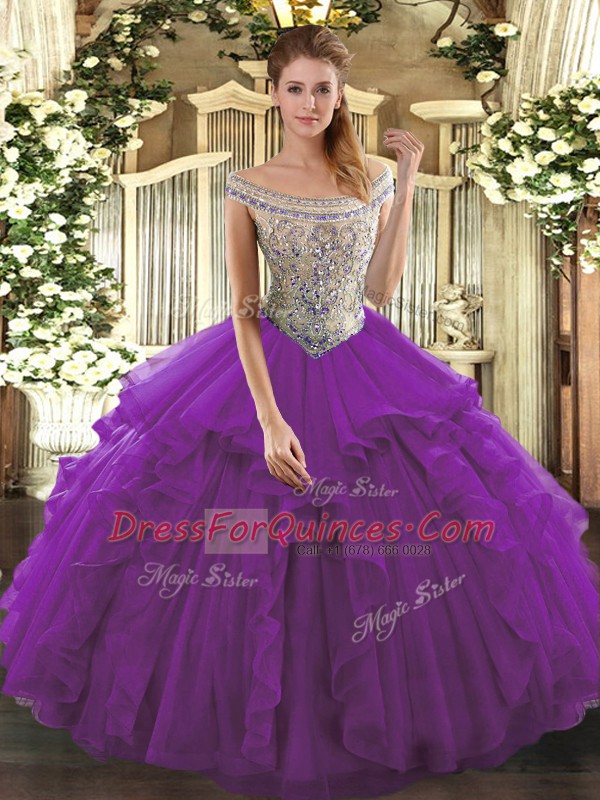 Eggplant Purple Tulle Lace Up Off The Shoulder Sleeveless Floor Length Quinceanera Gown Beading and Ruffles