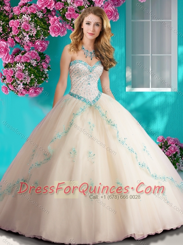 Elegant Beaded and Applique Tulle Quinceanera Dress in Champagne