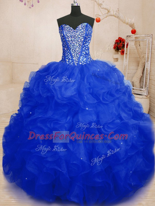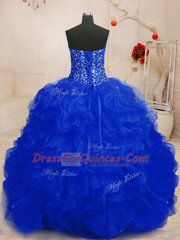 Extravagant Royal Blue Organza Lace Up 15th Birthday Dress Sleeveless Floor Length Beading and Ruffles