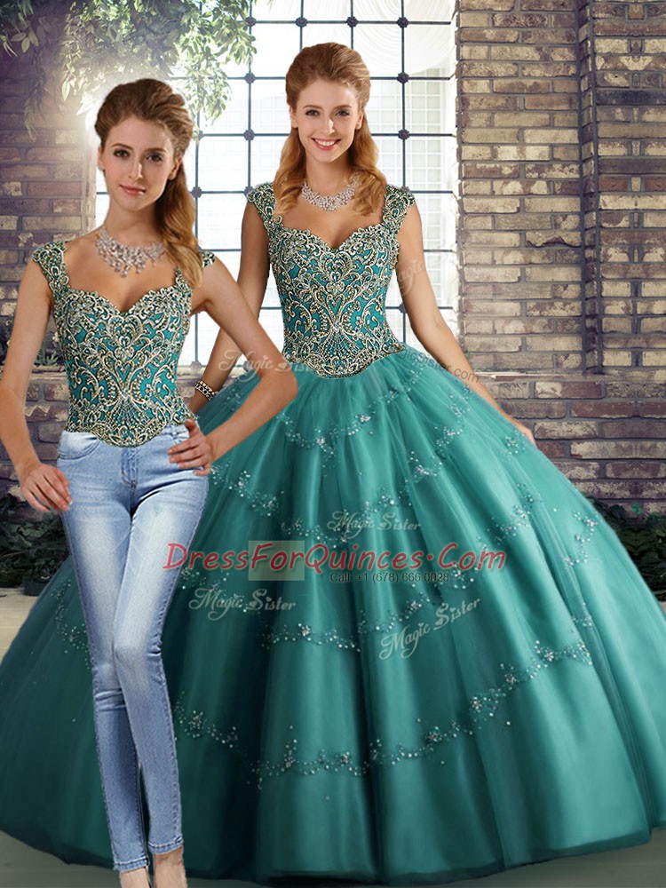 Fantastic Teal Lace Up 15th Birthday Dress Beading and Appliques Sleeveless Floor Length