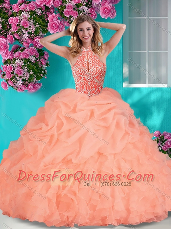 New Style Halter Top Beaded and Ruffled Quinceanera Dress with Brush Train