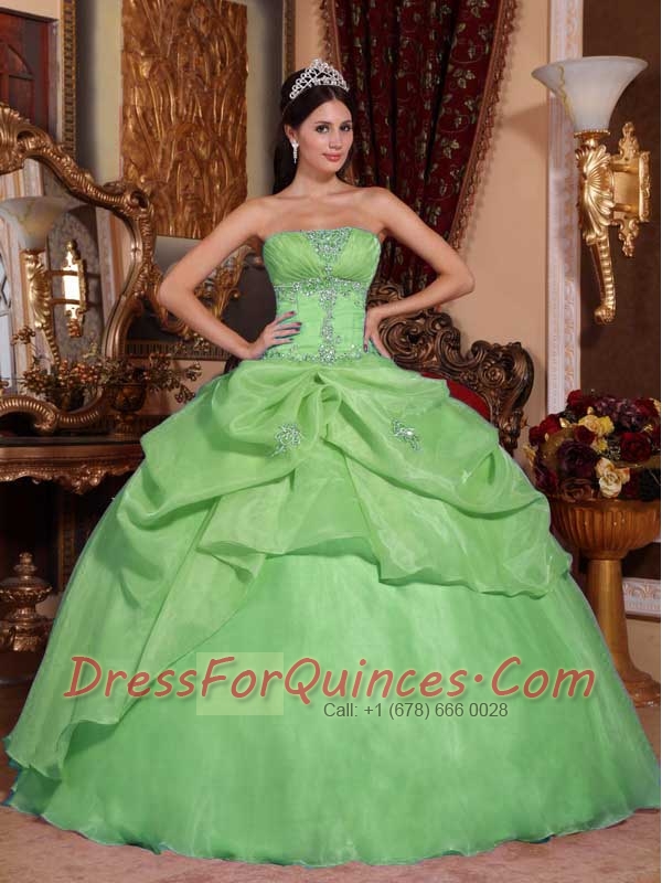 Popular Green Ball Gown Strapless With Organza Beading For Discount Quinceanera Dress