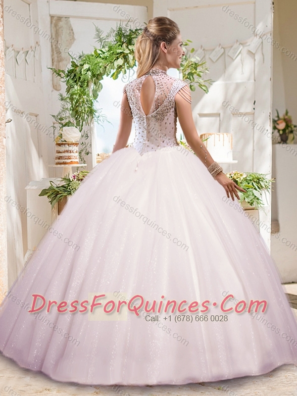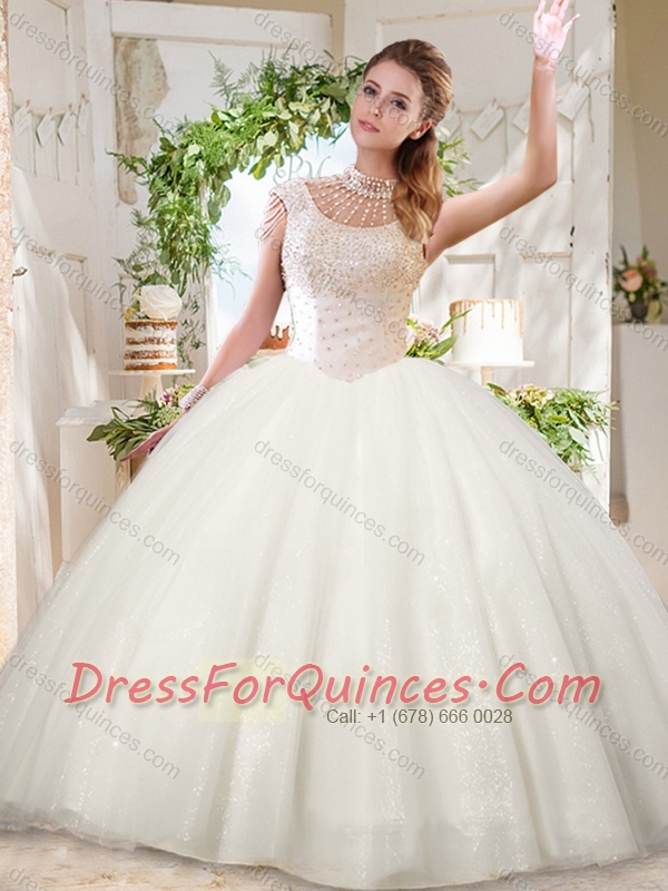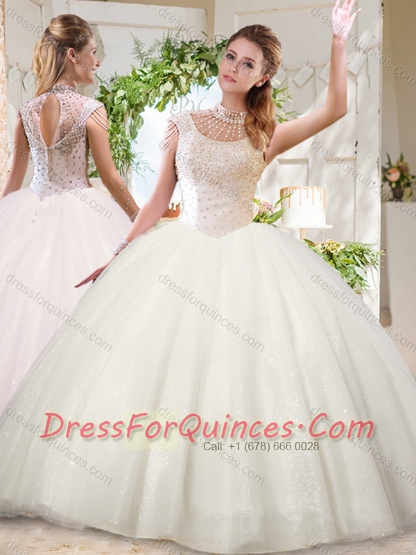 See Through White Ball Gowns High Neck Sequins Beaded Quinceanera Dress with Zipper Up