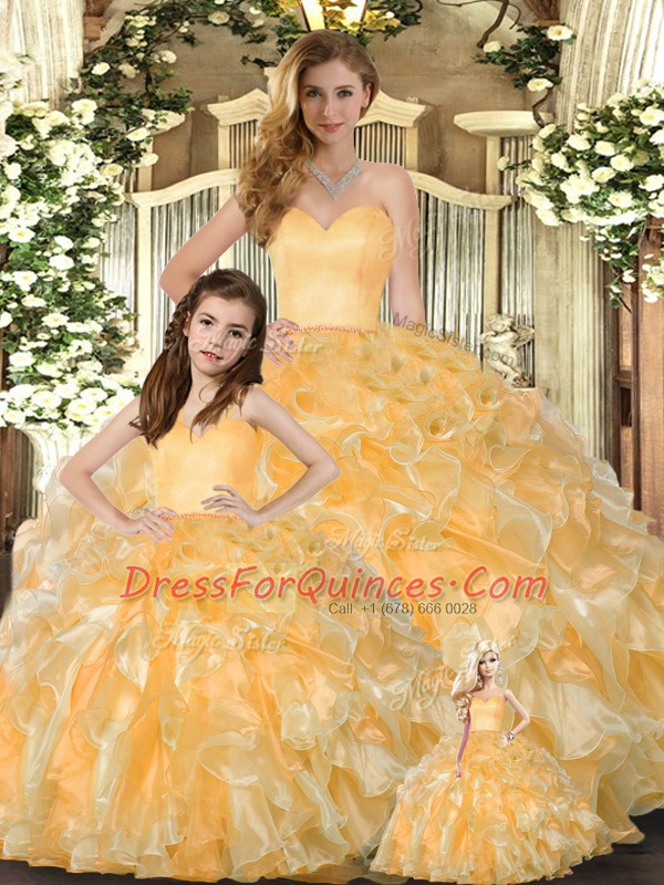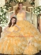 Sleeveless Organza Floor Length Lace Up Quinceanera Dress in Gold with Beading and Ruffles