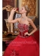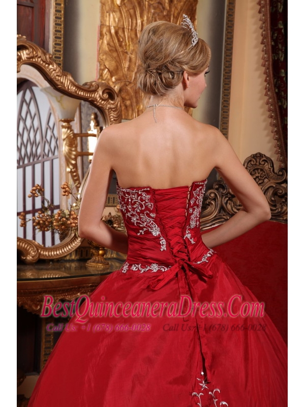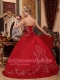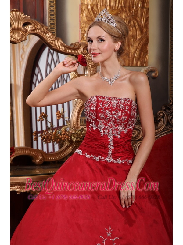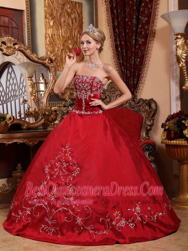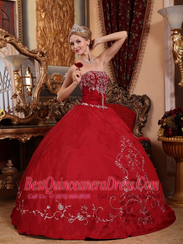 Wine Red Ball Gown Strapless Floor-length Satin Embroidery Quinceanera Dress
