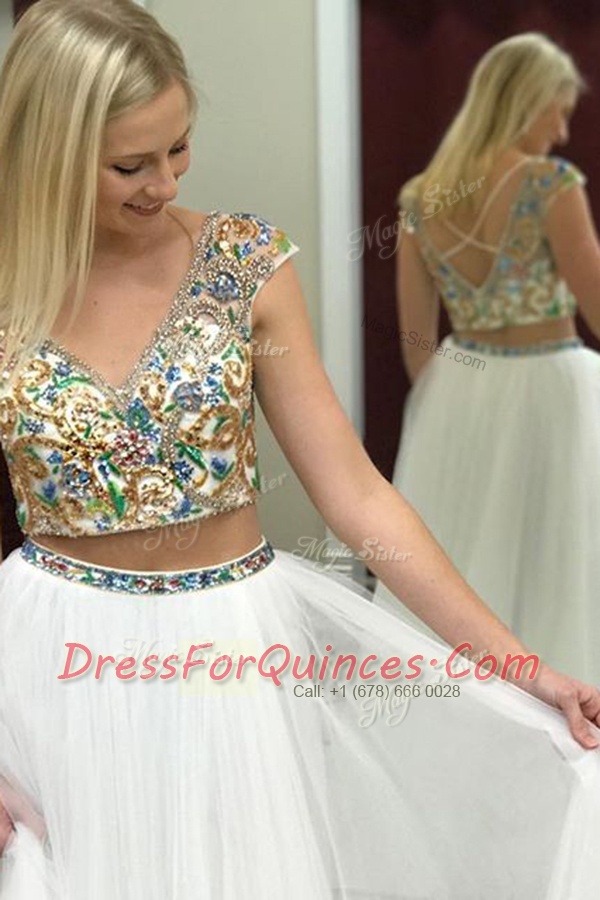 Enchanting V-neck Cap Sleeves Tulle Evening Dress Beading Criss Cross