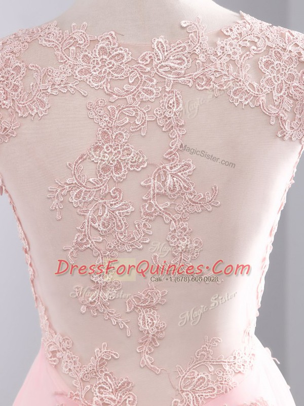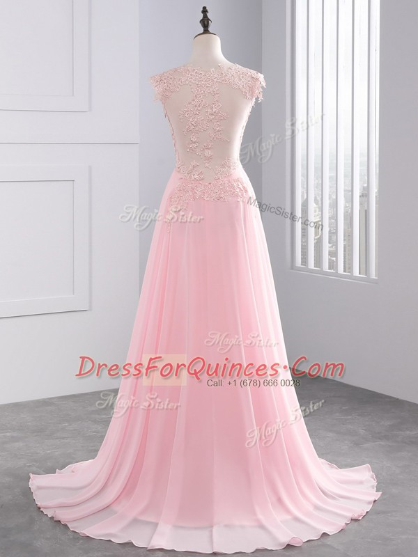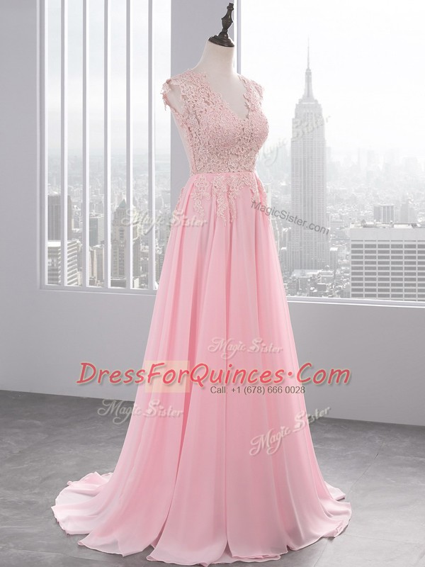 Fashion Baby Pink Chiffon Side Zipper V-neck Sleeveless Prom Dress Brush Train Appliques