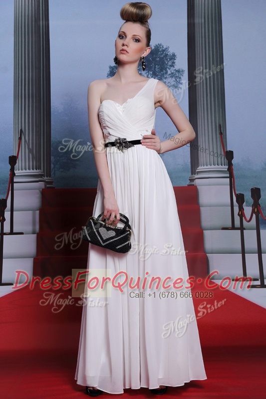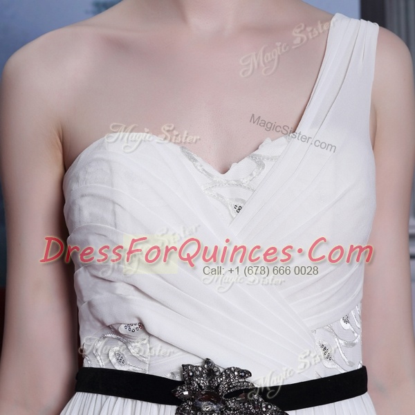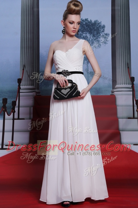 Gorgeous Sweetheart Sleeveless Evening Dress Floor Length Ruching and Belt White Chiffon