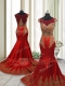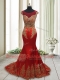 Graceful Wine Red Mermaid Elastic Woven Satin Scoop Cap Sleeves Appliques With Train Side Zipper Prom Dresses Sweep Train