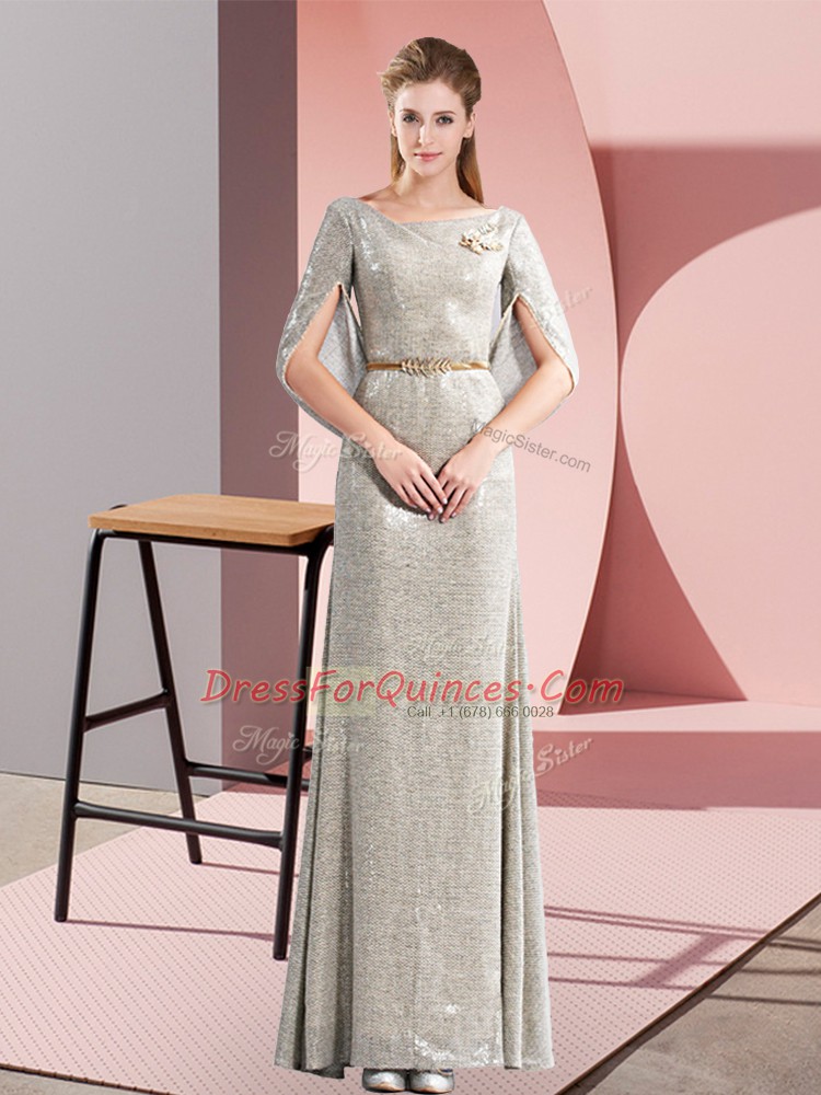 Half Sleeves Floor Length Belt Zipper Homecoming Dress with Grey