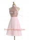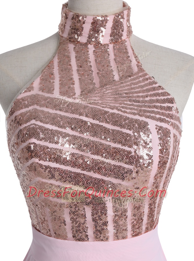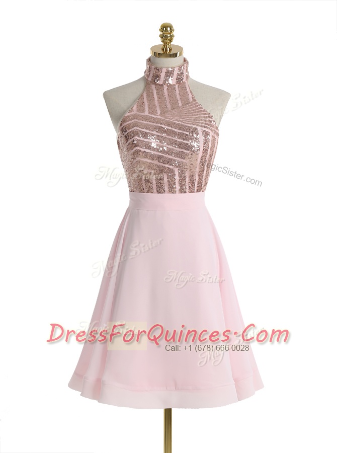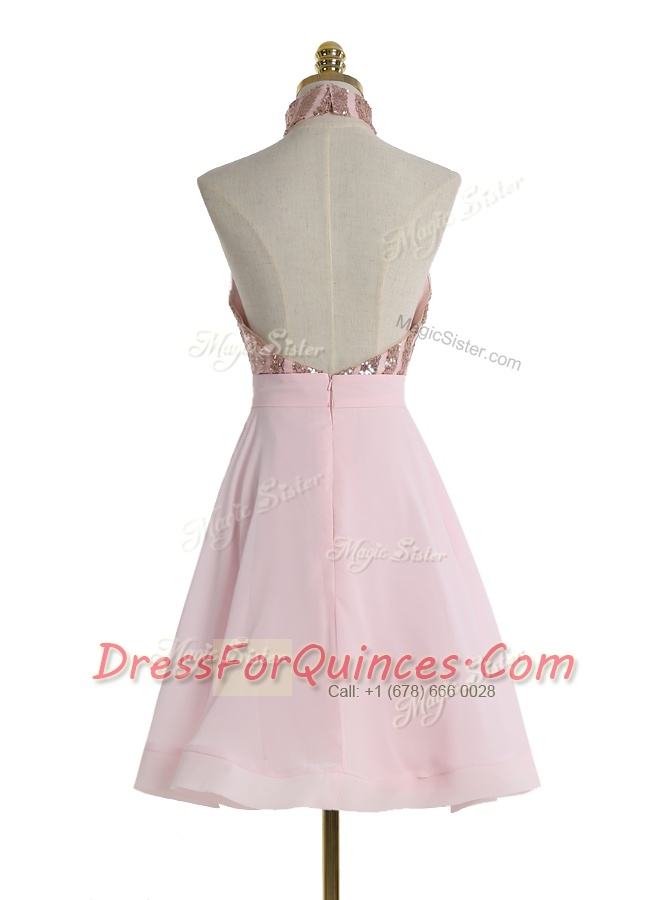 Halter Top Sleeveless Chiffon Knee Length Backless Homecoming Dress in Baby Pink with Sequins