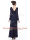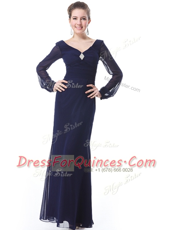 High End Navy Blue V-neck Side Zipper Ruching Long Sleeves