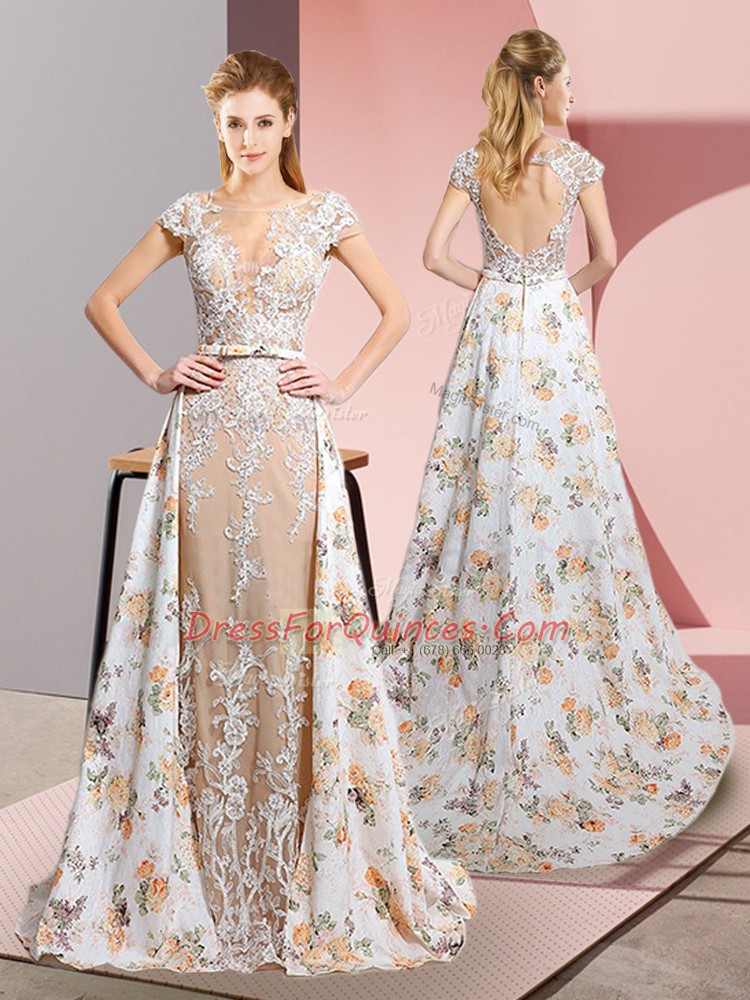 High Quality Scoop Short Sleeves Chiffon Prom Dress Lace and Appliques Brush Train Backless
