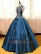 Latest Navy Blue A-line High-neck Sleeveless Satin Floor Length Backless Appliques Prom Dress