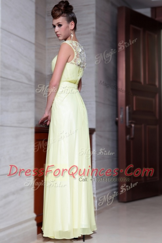 Light Yellow Prom Party Dress Prom and Party and For with Beading and Hand Made Flower Scoop Cap Sleeves Zipper