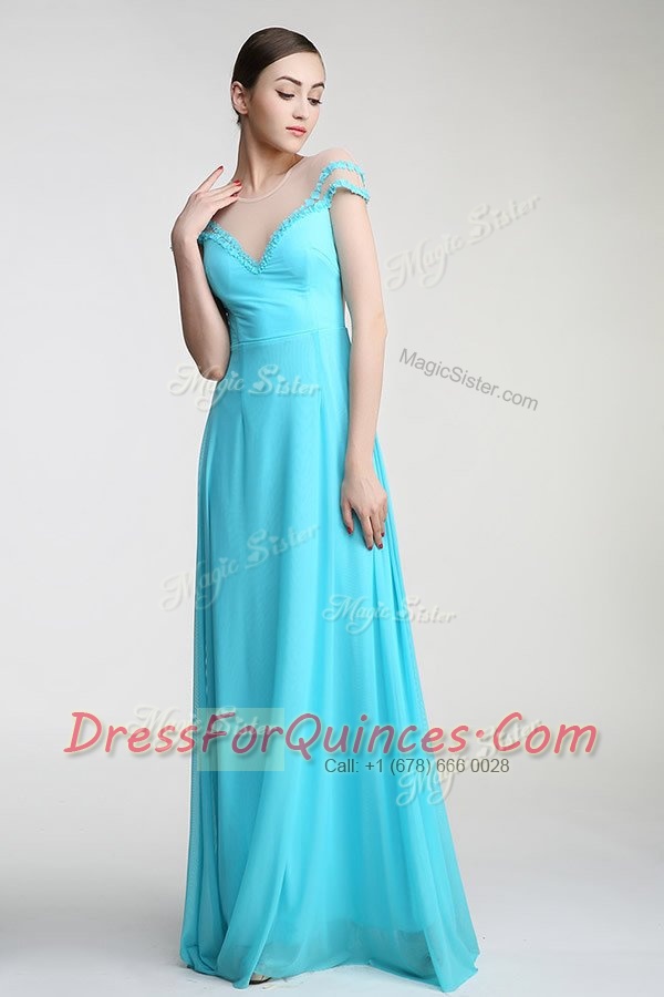 Luxurious Scoop Appliques and Bowknot Prom Dresses Aqua Blue Zipper Short Sleeves Floor Length