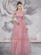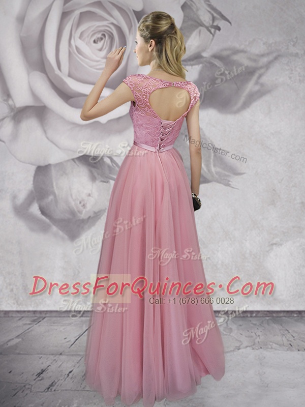 Luxury Scoop Cap Sleeves Lace Up Prom Dresses Pink Tulle
