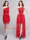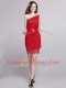 One Shoulder Red Tulle and Lace Zipper Prom Dress Sleeveless Floor Length Lace and Bowknot