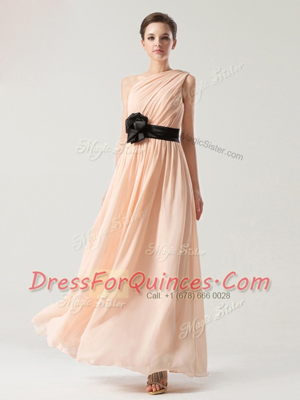 One Shoulder Sleeveless Chiffon Ankle Length Side Zipper Evening Dress in Peach with Belt