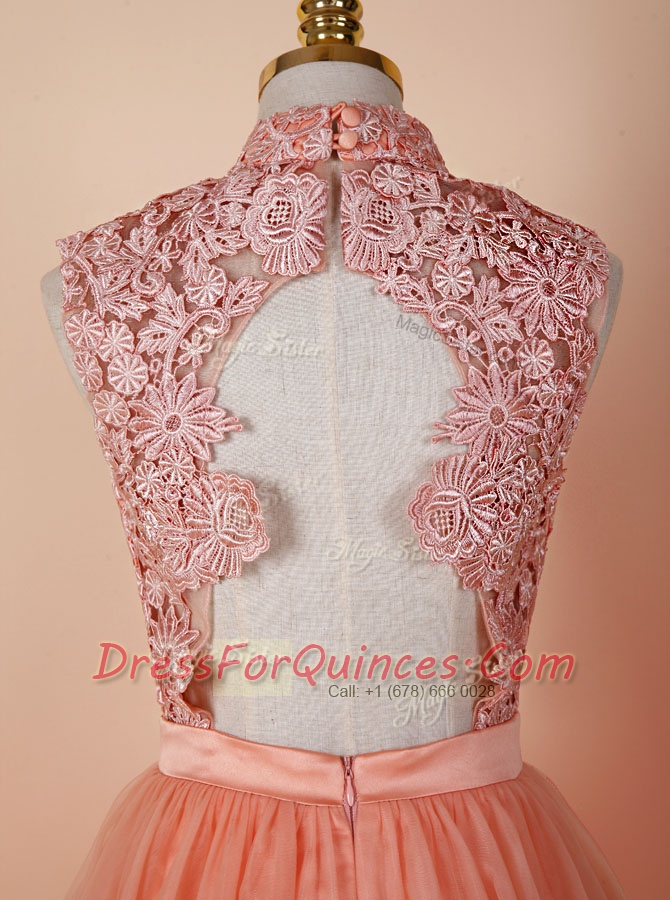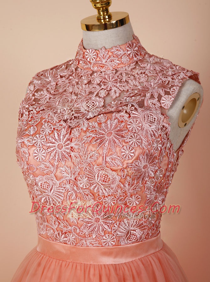 Peach Backless High-neck Appliques Prom Dress Organza Sleeveless