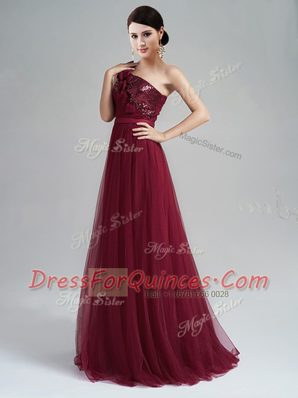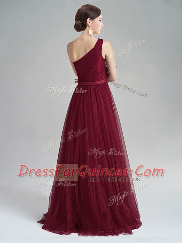 Perfect Burgundy Zipper One Shoulder Appliques and Sequins and Belt Prom Dresses Tulle Sleeveless Brush Train