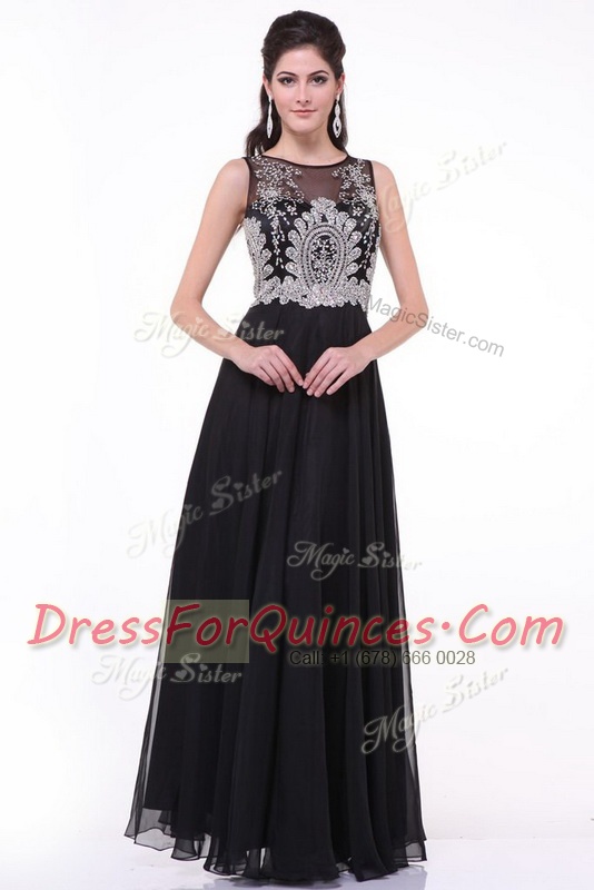 Scoop Black Sleeveless Beading and Appliques and Ruching Floor Length
