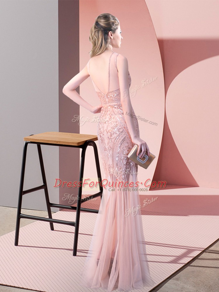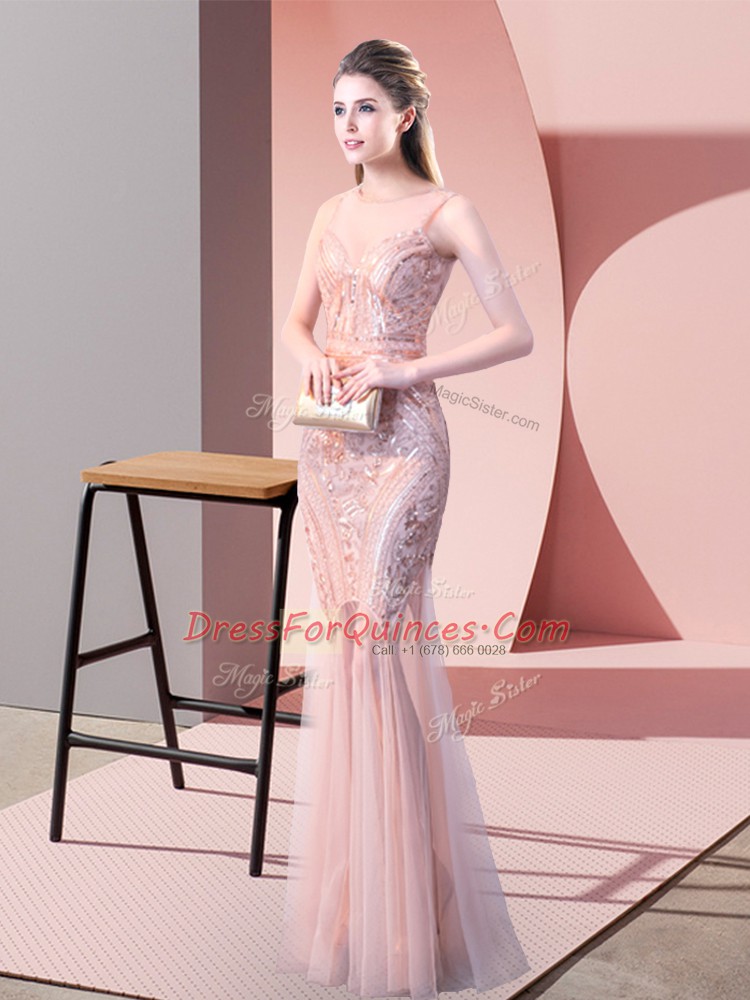 Scoop Sleeveless Floor Length Sequins Pink Tulle