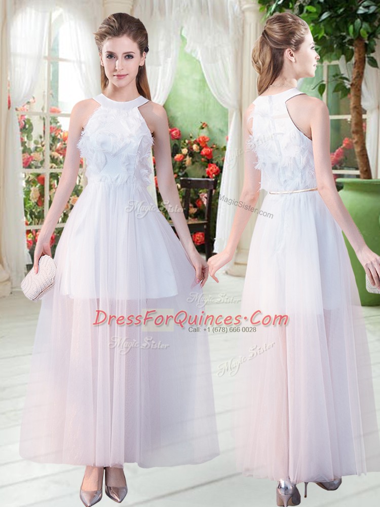 Scoop Sleeveless Prom Party Dress Ankle Length Appliques White Tulle