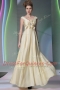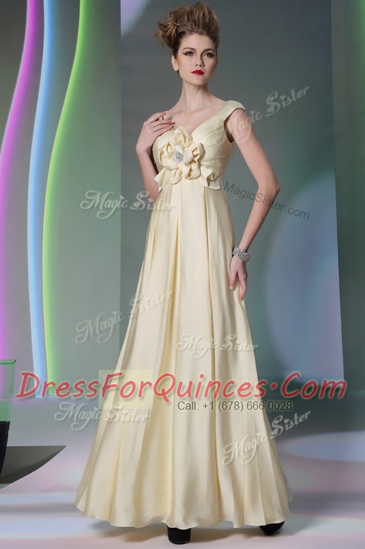 Shining Scoop Floor Length Side Zipper Evening Dress Light Yellow for Prom and Party with Beading and Ruching and Hand Made Flower