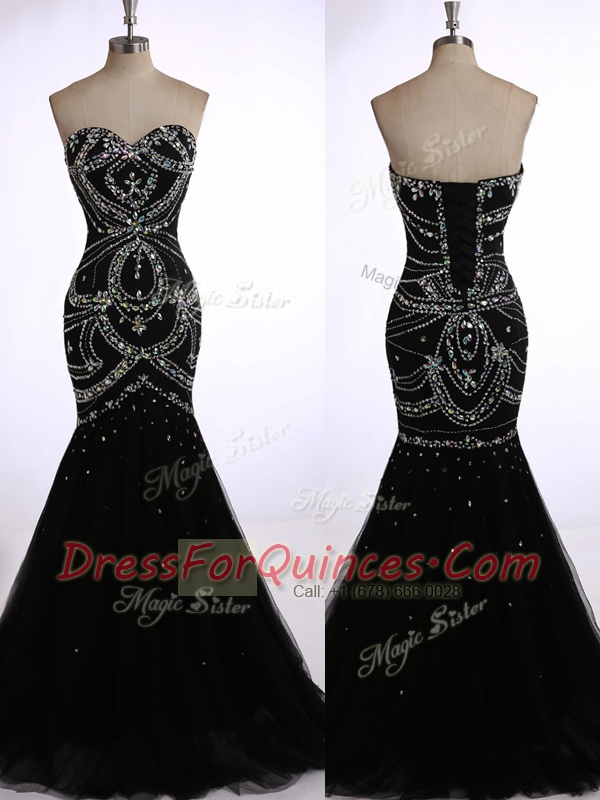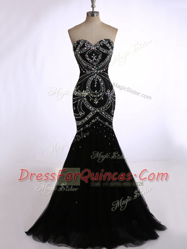 Sophisticated Mermaid Black Sleeveless Brush Train Beading Dress for Prom