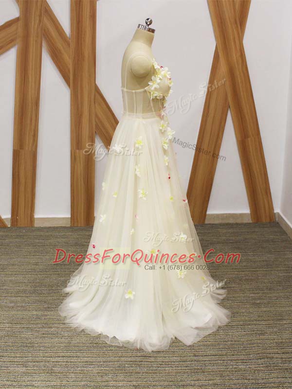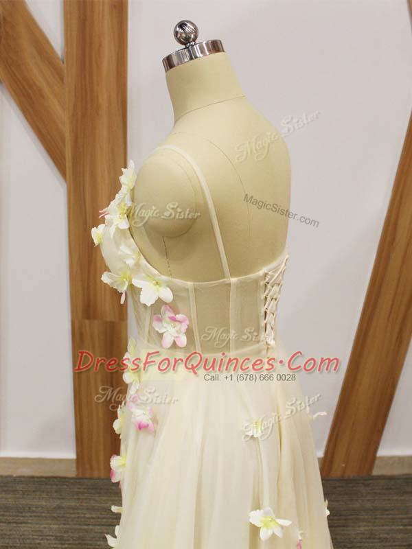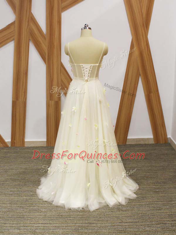Straps Sleeveless Tulle Prom Dress Hand Made Flower Lace Up