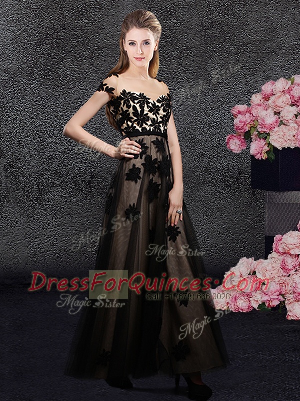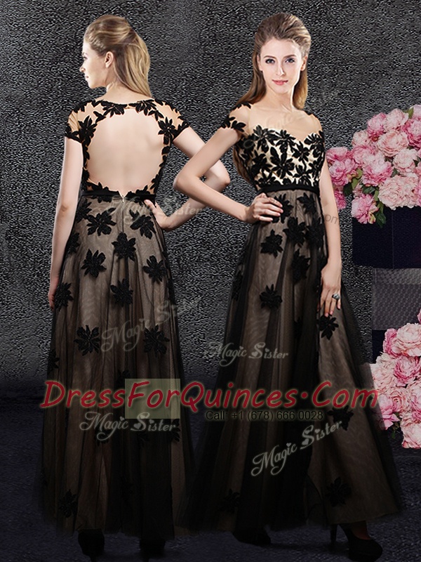 Suitable Black Tulle Backless Sweetheart Short Sleeves Ankle Length Prom Evening Gown Appliques