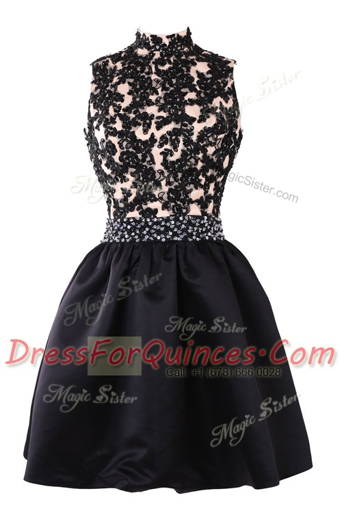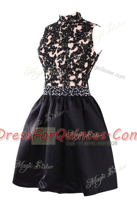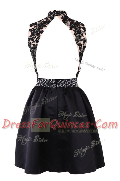 Super Black A-line Satin High-neck Sleeveless Beading and Appliques Knee Length Backless