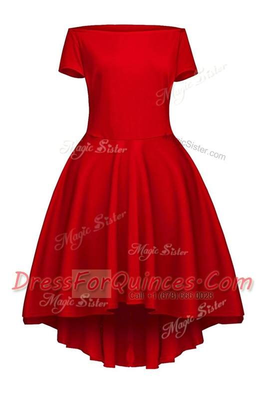 Tea Length Wine Red Prom Gown Satin Short Sleeves Ruching