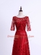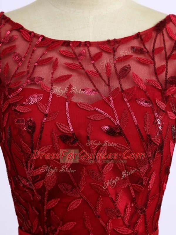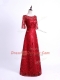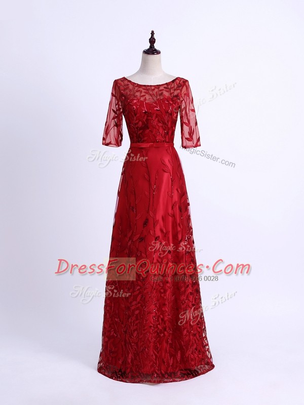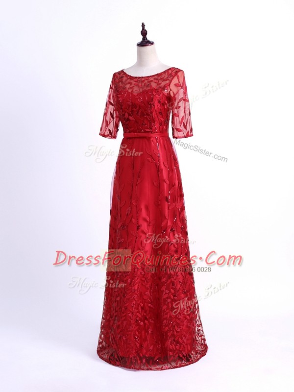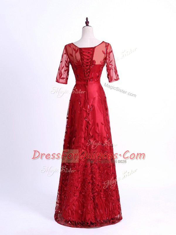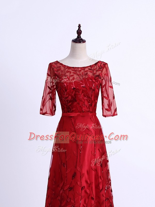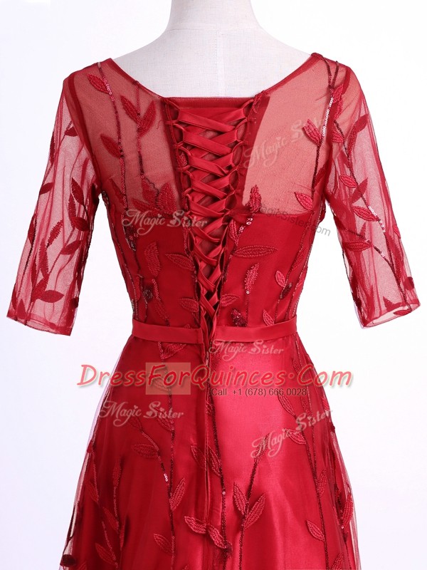Top Selling Column/Sheath Evening Dress Red Scoop Tulle Half Sleeves Lace Up