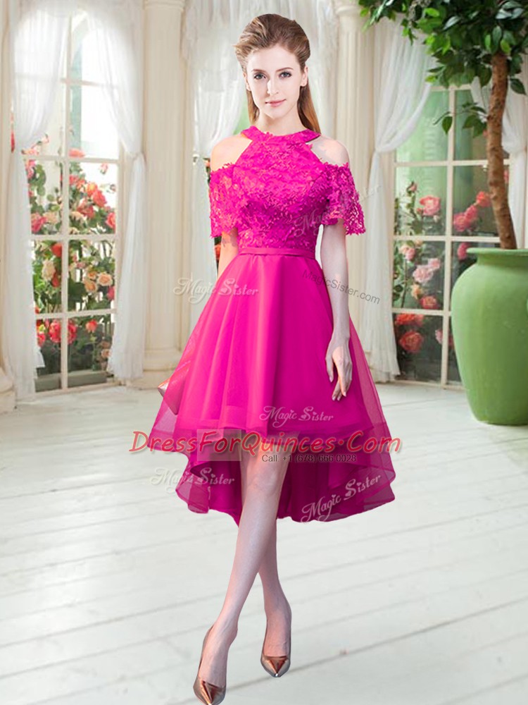 Tulle High-neck Short Sleeves Zipper Lace in Hot Pink
