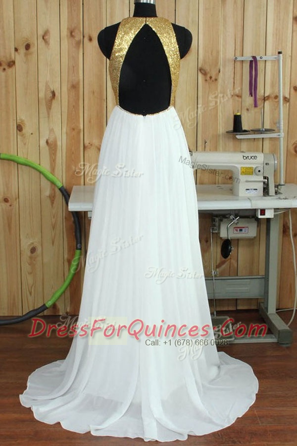 Vintage Chiffon Scoop Sleeveless Sweep Train Backless Sequins Prom Dress in White