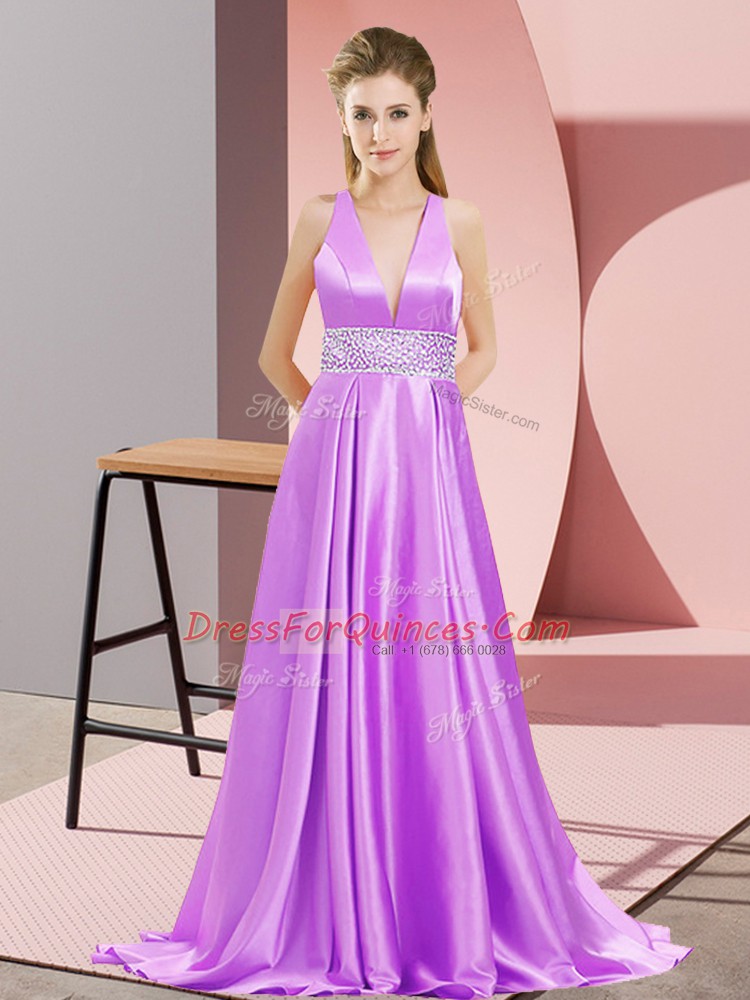 V-neck Sleeveless Prom Gown Brush Train Beading Lavender Elastic Woven Satin