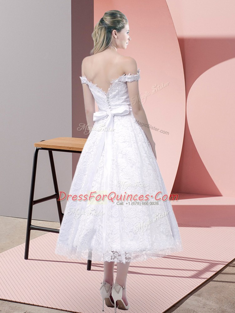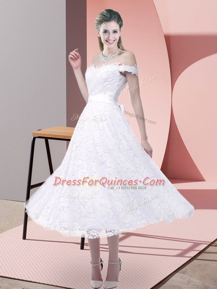 White Lace Criss Cross Strapless Sleeveless Tea Length Prom Gown Belt