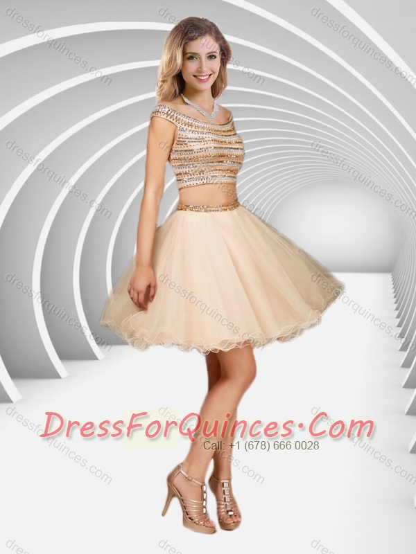 2016 Two Piece Off the Shoulder A Line Sequined Prom Dress in Champagne