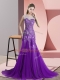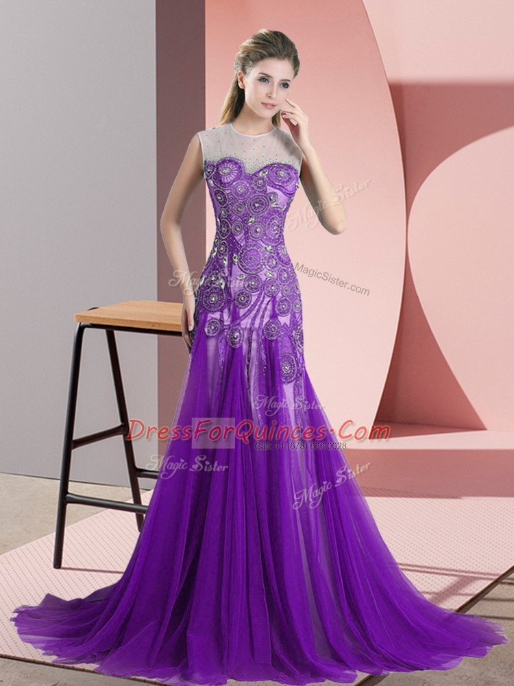 Fantastic Scoop Sleeveless Sweep Train Backless Prom Dress Purple Tulle