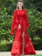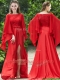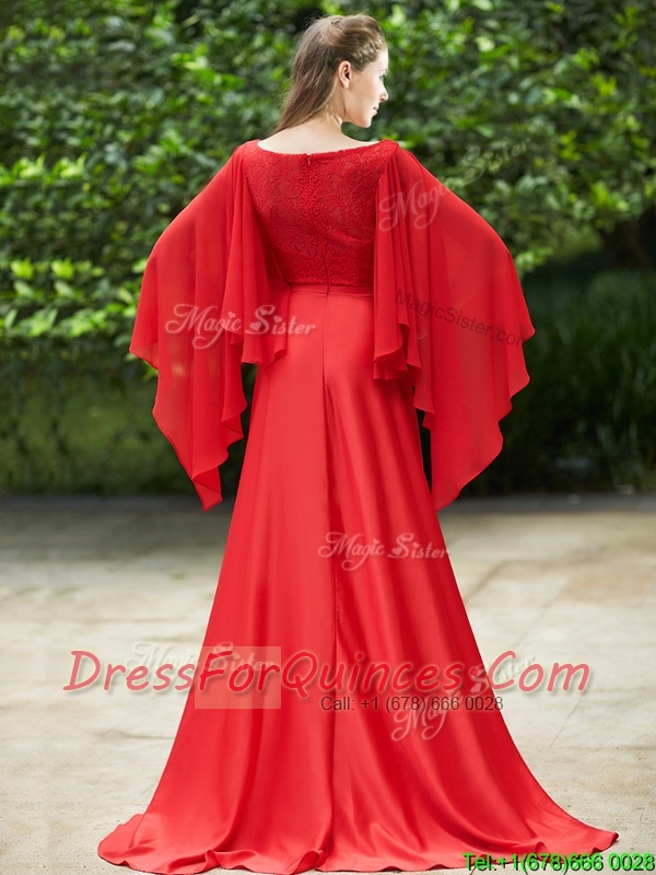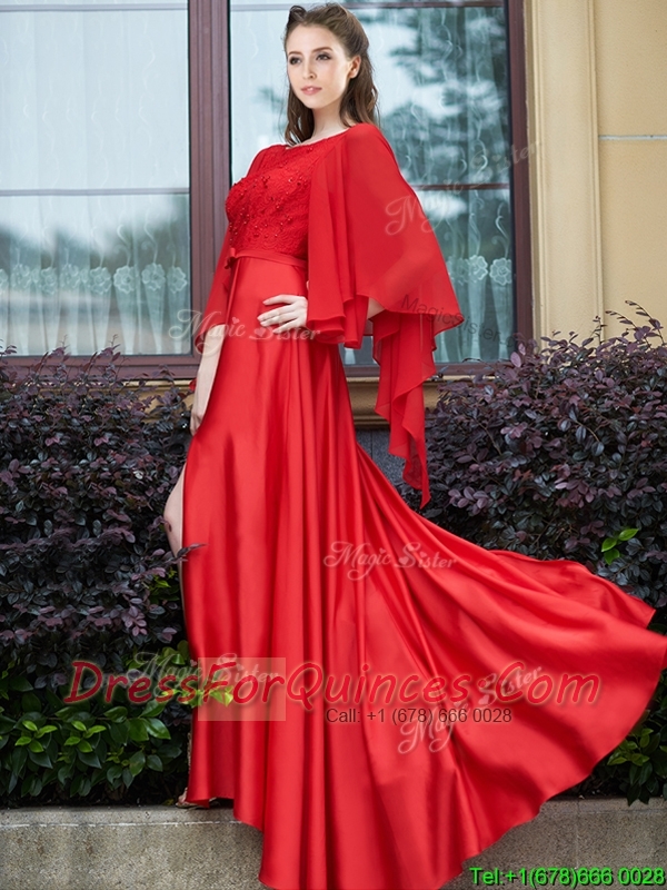 Pretty Bateau Long Sleeves Red Prom Dresses with Beading and High Slit