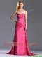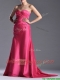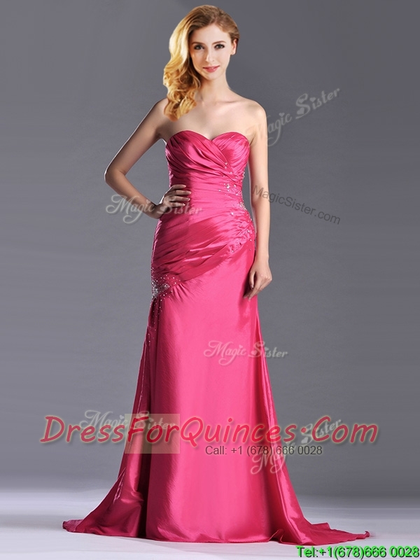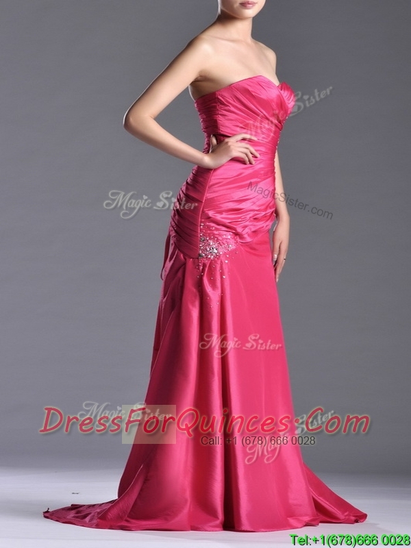 Pretty Beaded and Ruched Coral Red Column Prom Dress with Brush Train