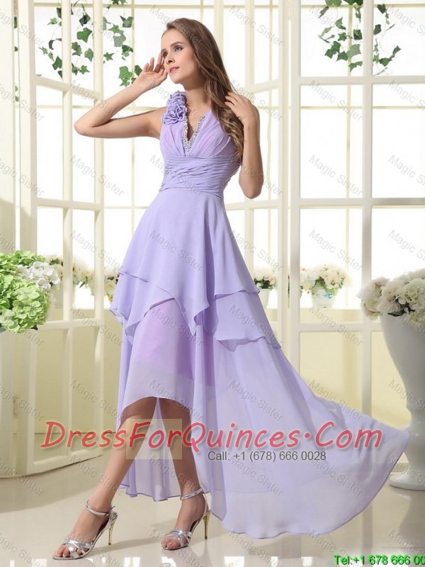 Pretty Empire V Neck Prom Dresses with High Low in Lavender