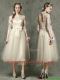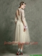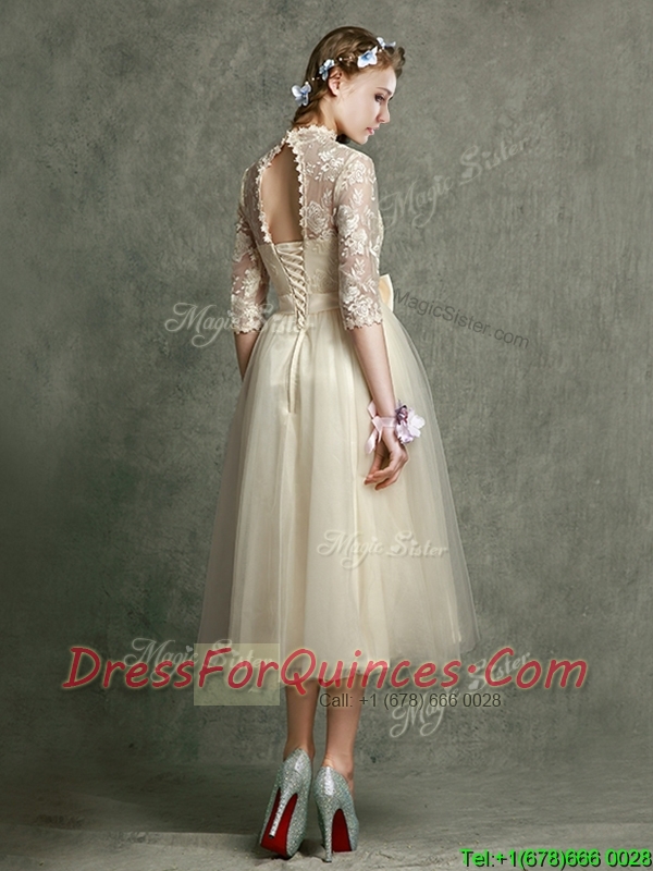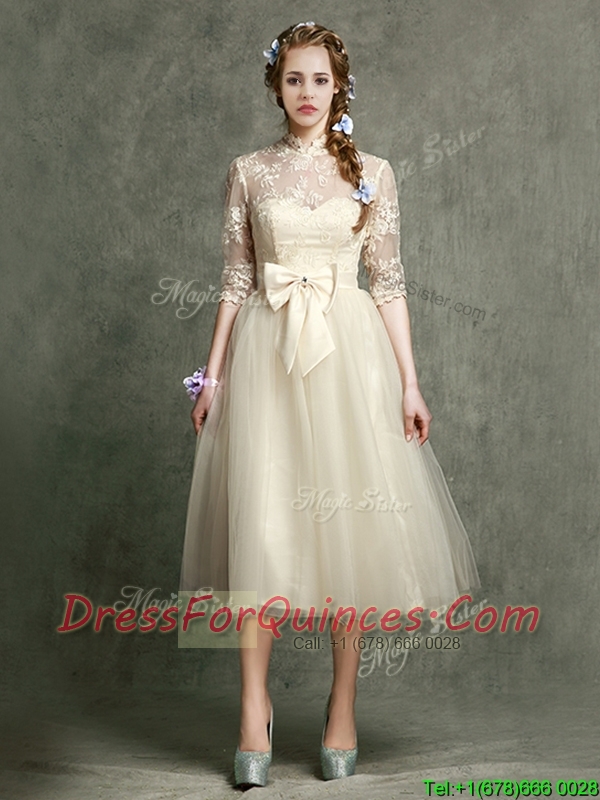 See Through High Neck Half Sleeves Prom Dresses with Lace and Bowknot