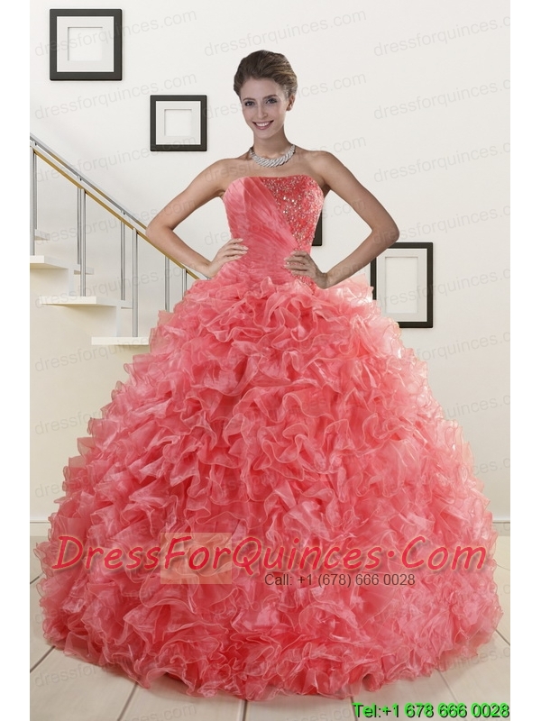 2015 New Arrival Watermelon Red Sweet 15 Dress with Beading
